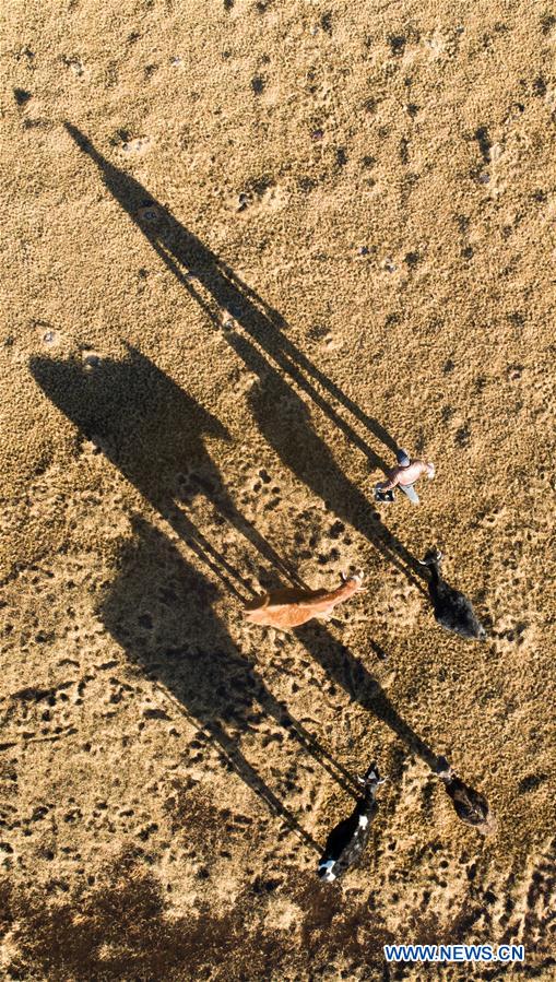 Aerial photo taken on Dec. 8, 2019 shows a herder walking along the Yarlung Zangbo River in southwest China's Tibet Autonomous Region. (Xinhua/Purbu Zhaxi)