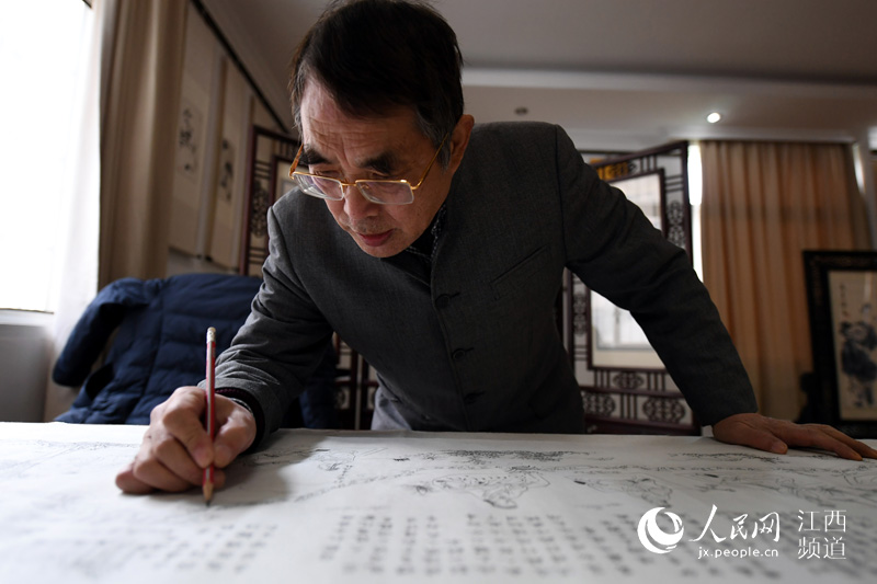 Gu draws patterns on paper before beginning the embroidery. (Photo/Shi Yu)