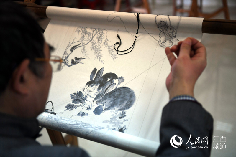Gu Yuchun embroiders flowers on Xuan paper. (Photo/Shi Yu)