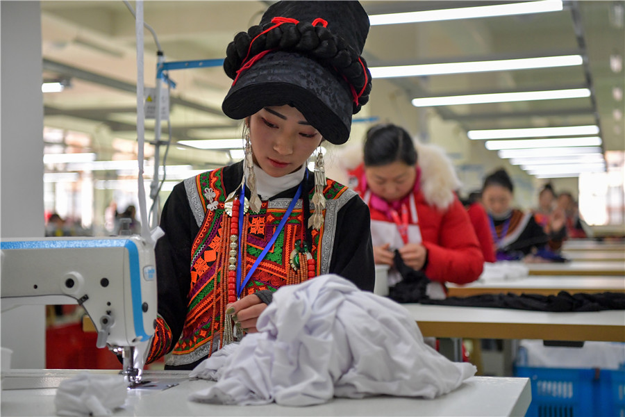A woman works in a clothing manufacturing workshop in Shaoxing, Zhejiang province, which helps lift people from poverty. ZHANG CHAOQUN/XINHUA