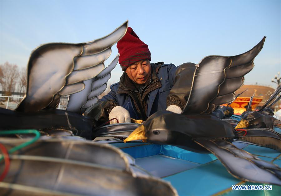 A worker makes a lantern in a flower expo park in Yinchuan, northwest China's Ningxia Hui Autonomous Region, Dec. 24, 2019. Workers make giant lanterns for the upcoming lantern festival which will be held from Dec. 31, 2019 to Feb. 9, 2020. (Xinhua/Jia Haocheng)