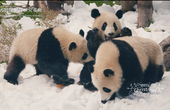 Pandas at the Chengdu Research Base of Giant Panda Breeding were finally able to frolic in the snow after artificial flakes made by the staff members covered the playgrounds of the cuddly animals on Dec. 25.