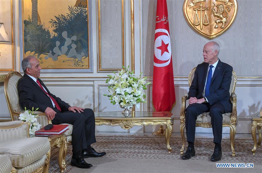 Tunisian President Kais Saied (R) meets with Tunisian Prime Minister-designate Habib Jemli in Tunis, Tunisia, on Jan. 1, 2020. Tunisian Prime Minister-designate Habib Jemli said on Wednesday that he had offered the lineup of his new government to President Kais Saied. (Tunisian Presidency/Handout via Xinhua)