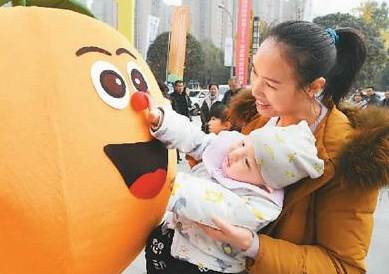 A baby interacts the mascot of an expo in Fengjie, Chongqing municipality. (Photo/Xinhua)
