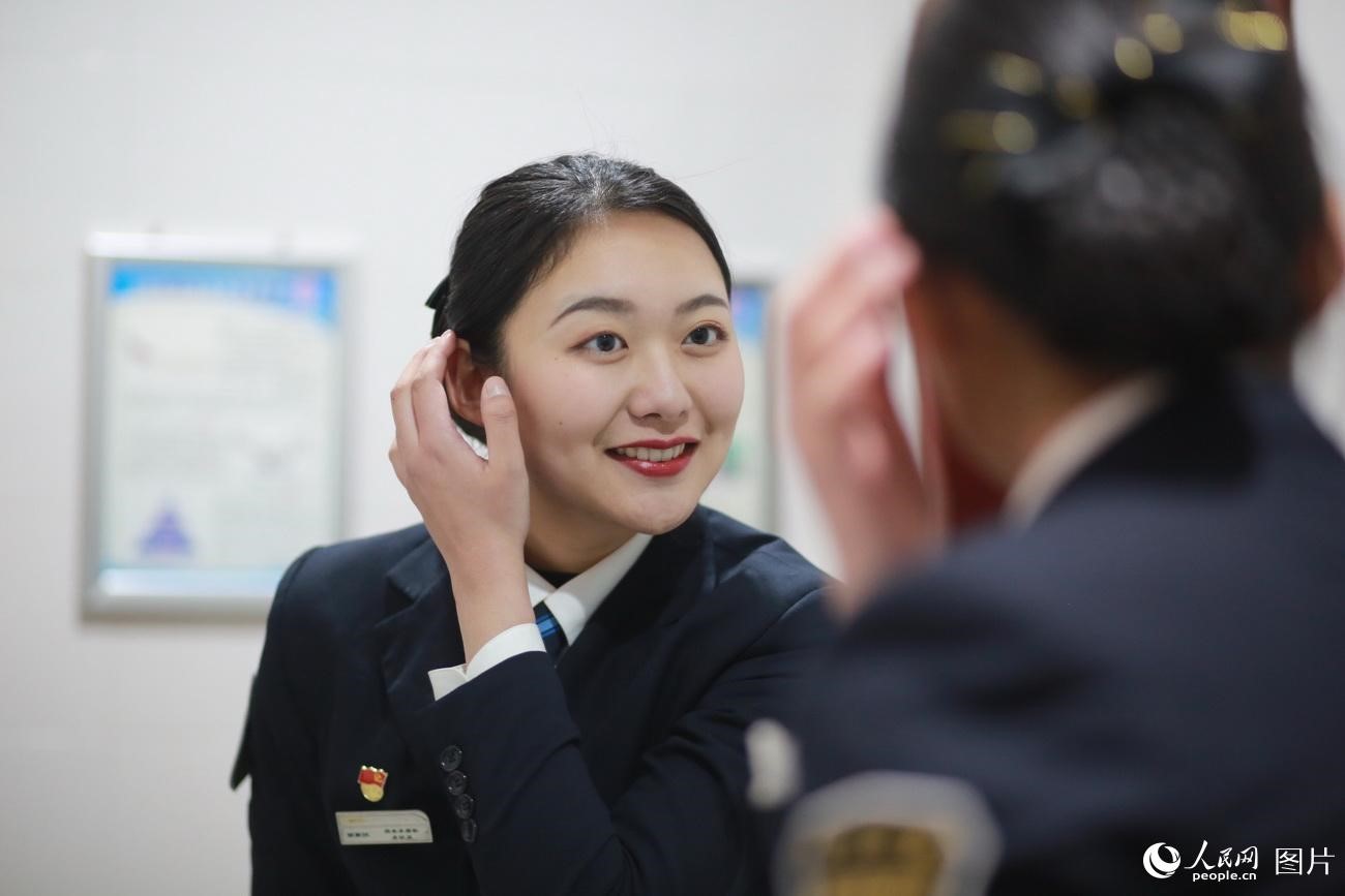 Liu checks herself in the mirror to show her best self in front of the travelers. (Photo/People's Daily Online)