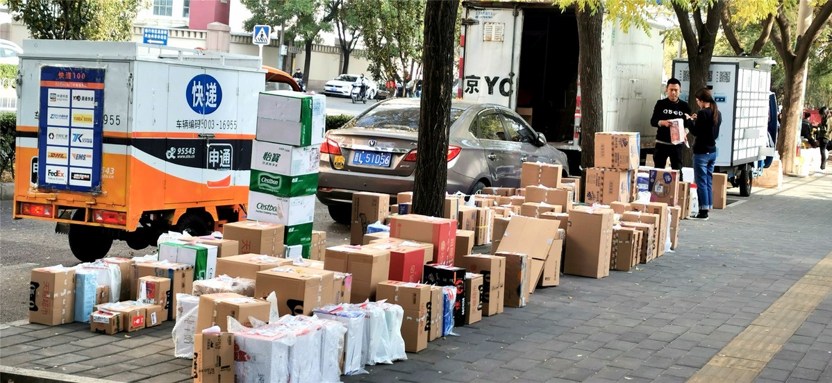 Delivery parcels line a street in Beijing on Nov 12, 2019, the day following the annual Double Eleven shopping spree. [Photo by Fu Jing/chinadaily.com.cn]