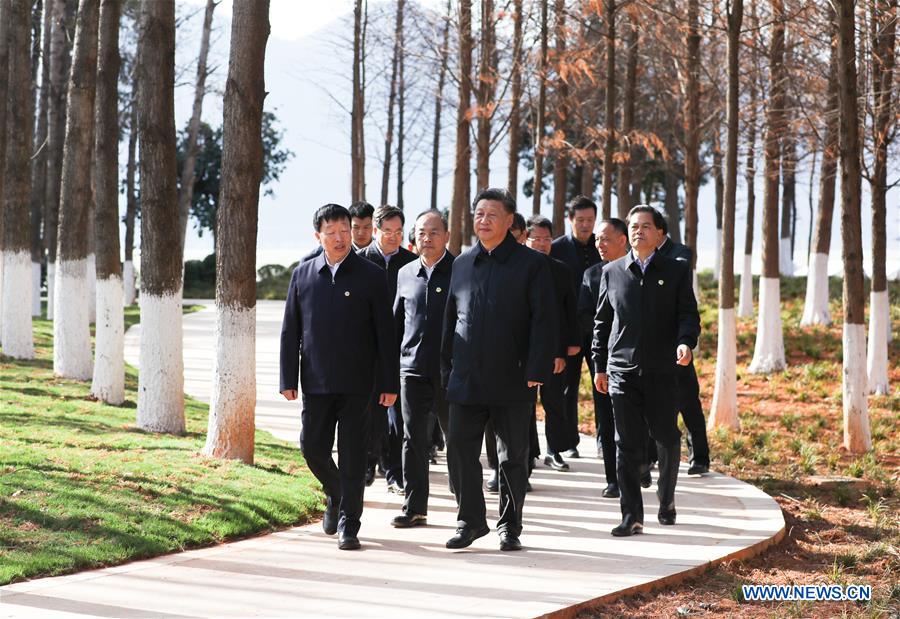 President Xi Jinping, also general secretary of the Communist Party of China (CPC) Central Committee and chairman of the Central Military Commission (CMC), visits an ecological wetland of Dianchi Lake in Kunming, capital of southwest China's Yunnan Province, Jan. 20, 2020. Xi visited the wetland to examine the protection and pollution treatment of the lake during an inspection tour to the province. (Xinhua/Xie Huanchi)