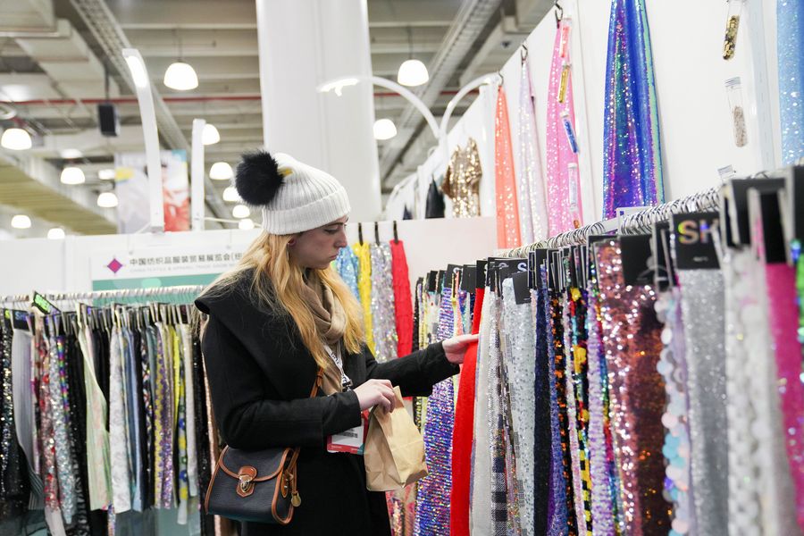 A buyer looks at product samples during the 21th China Textile and Apparel Trade Show (New York) in New York, the United States, Jan. 21, 2020. (Xinhua/Wang Ying)