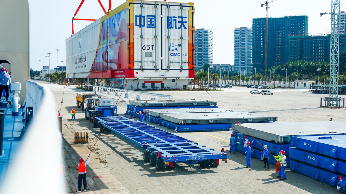 The first Long March 5B carrier rocket arrives at the Wenchang Space Launch Center in Hainan province on Wednesday for prelaunch preparations. [Photo provided to chinadaily.com.cn]