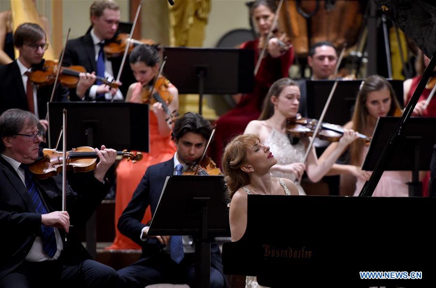 Pianist Donka Angacheva (front) performs during the 2020 Gala concert for Chinese New Year at the golden hall of Vienna's Musikverein in Vienna, Austria, Feb. 4, 2020. The 2020 Gala concert for Chinese New Year was held in the Golden Hall in Vienna, Austria, on Tuesday evening. This concert also launched a fundraising event for the fight against the coronavirus outbreak in China. (Xinhua/Guo Chen)