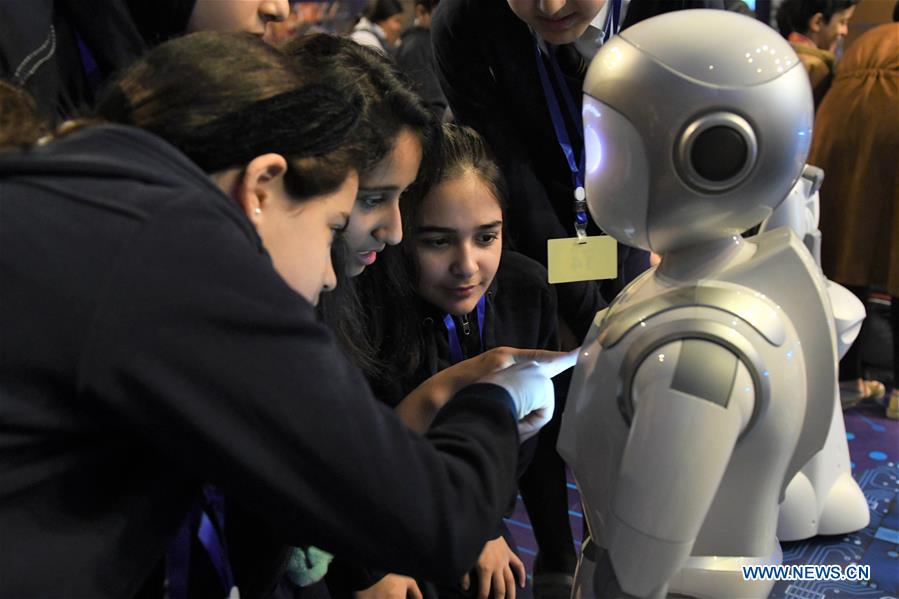Children interact with a robot at the Robotics and Artificial Intelligence (AI) Festival in Hawalli Governorate, Kuwait, on Feb. 9, 2020. Kuwait launched on Sunday the Robotics and Artificial Intelligence (AI) Festival to promote the scientific awareness in Kuwait. (Photo by Ghazy Qaffaf/Xinhua)