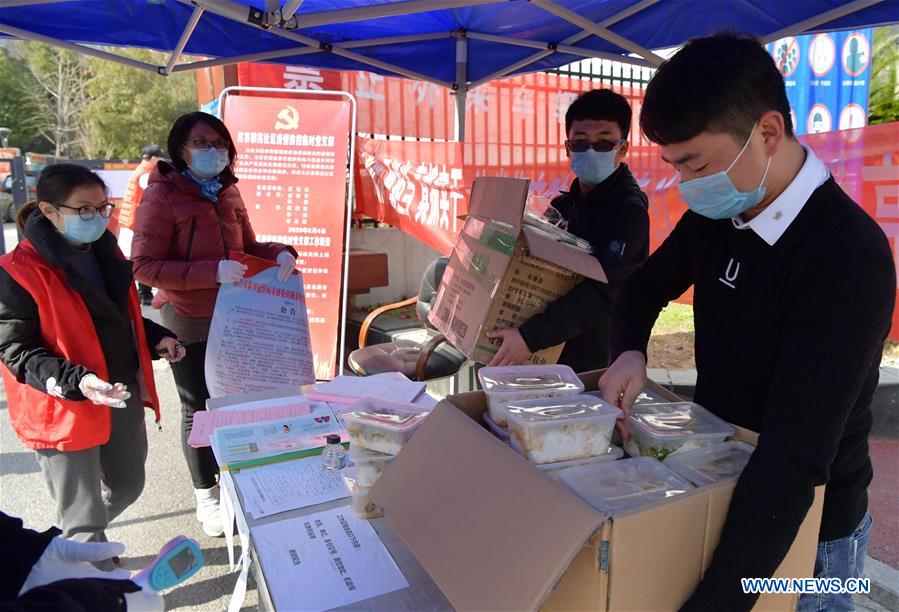 Han Haiming (1st R) distributes food to community staff in Honggutan New District of Nanchang City, east China's Jiangxi Province, Feb. 9, 2020. Han Haiming, a 21-year-old living in Nanchang with his family, started on Feb. 7 to supply free food for workers fighting the novel coronavirus at hospitals, communities and subway stations near his Lamian noodles restaurant, to support those fighting against the epidemic on the frontline in his way. By now, Han has provided 420 sets of meals. "I think it's time for everyone to work together and do the best we can to get over through the hard time," Han said. (Xinhua/Peng Zhaozhi)