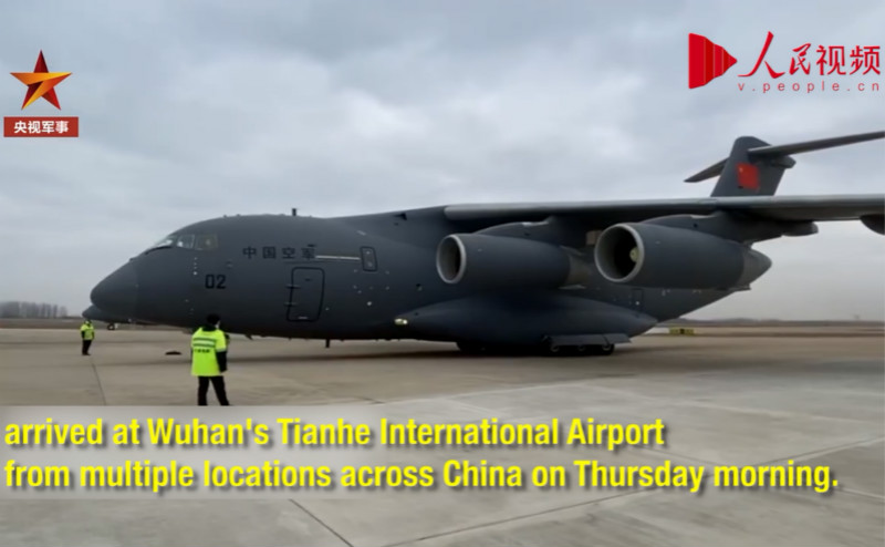 A total of 11 transport aircraft from the Chinese People's Liberation Army (PLA) Air Force, including multiple Y-20s, Il-76s and Y-9s, arrived at Wuhan's Tianhe International Airport from multiple locations across China on Thursday morning.