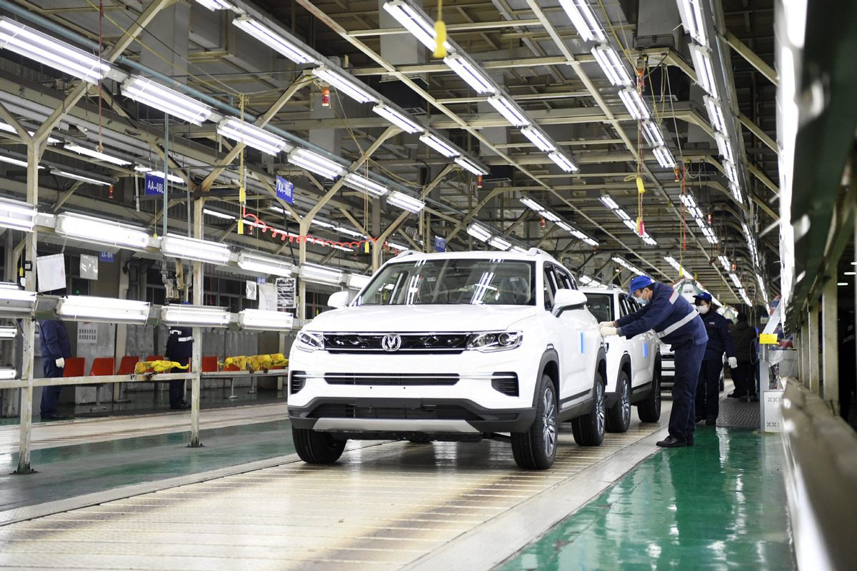 Staff members work at a production line of Yubei plant of Chongqing Changan Automobile Co Ltd in Chongqing, Southwest China, Feb 18, 2020. [Photo/Xinhua]