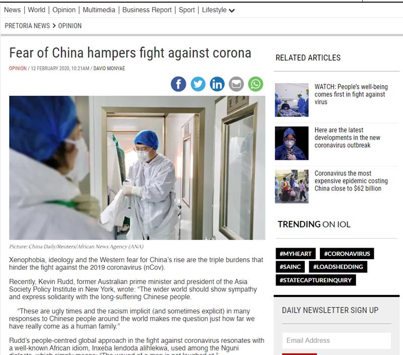 On Feb.12, Pretoria News, a newspaper under Independent Media, published an article by David Monyae, director of the Center for Africa-China Studies (CACS) at the University of Johannesburg, calling for enhanced solidarity and joint efforts to fight the epidemic.