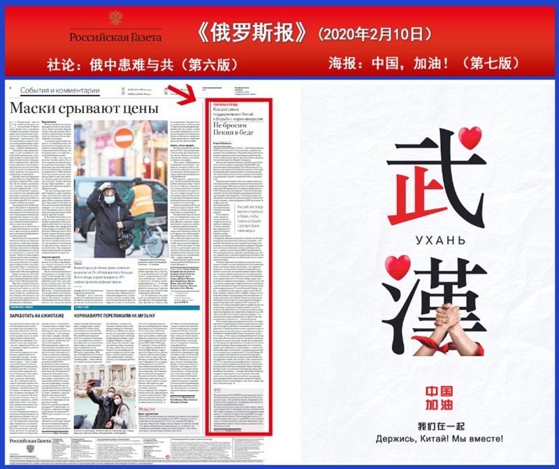 In addition, Rossiyskaya Gazeta released a full-page poster expressing strong support for Wuhan, the epicenter of the health crisis, and China, with the poster saying “Go, China! We stand together with you!”