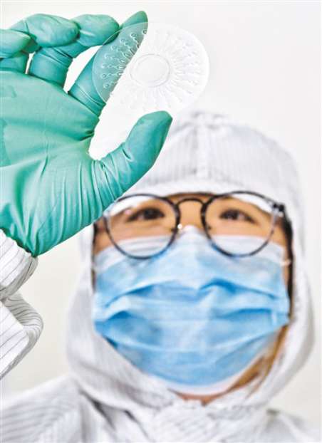 A researcher showcases a nucleic acid test chip developed by West China Hospital affiliated to Sichuan University and Tsinghua University. (Photo by Liu Kun/Xinhua News Agency)
