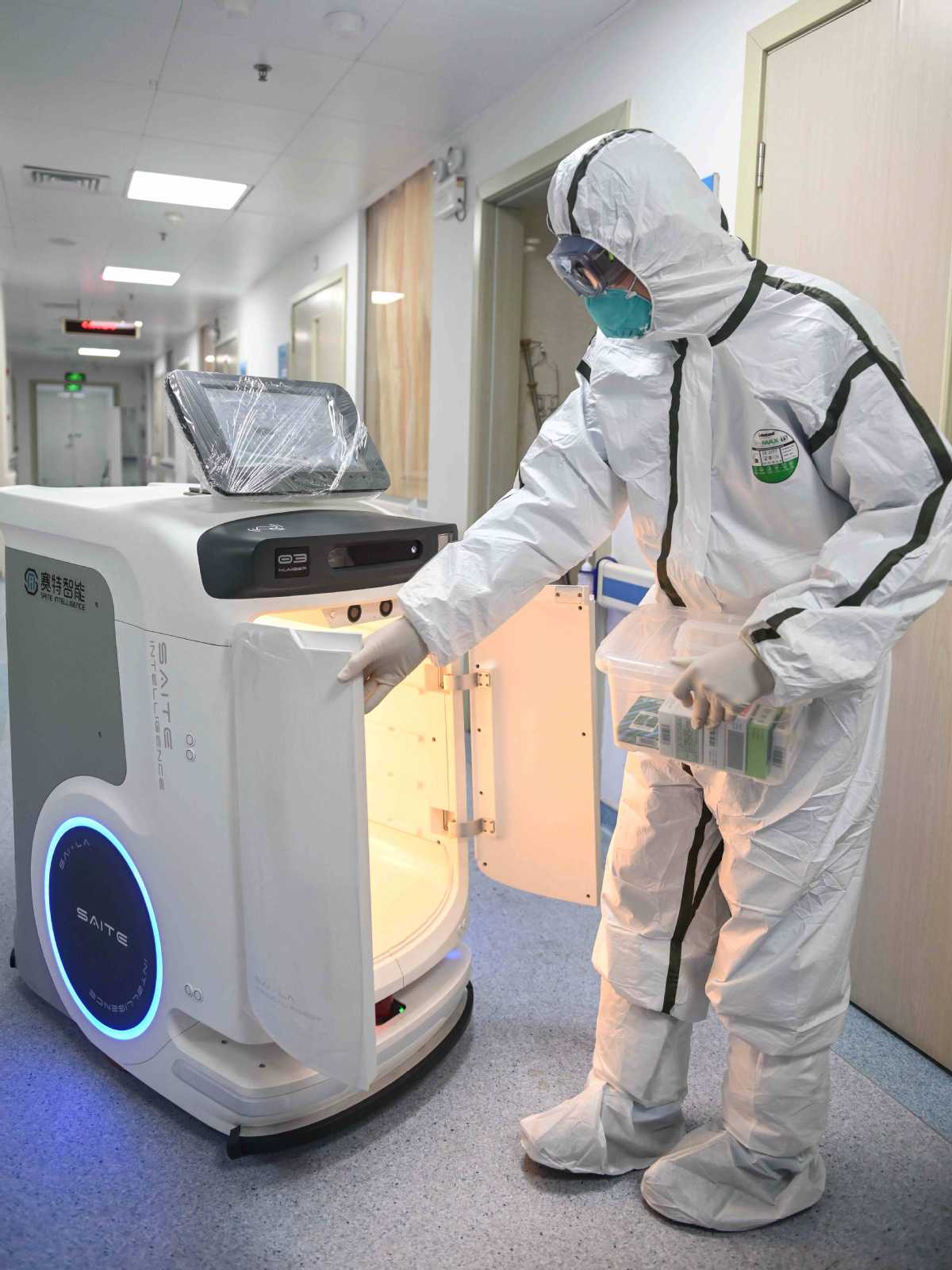 The newly introduced robots can save the medical workers the frequent need to put on and take off heavy protective outfits, including clothing, masks, goggles and boots, and help reduce the risk of infection. It takes an hour to put on and take off the whole set, said Luo.