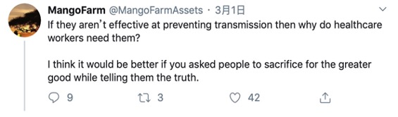 But his remarks immediately drew a skeptical response. Many argued that he had just contradicted himself and made the general populace seem “expendable” while putting people’s lives at risk. “If they aren’t effective at preventing transmission then why do healthcare workers need them?” a netizen with the screen name MongoFarm asked.