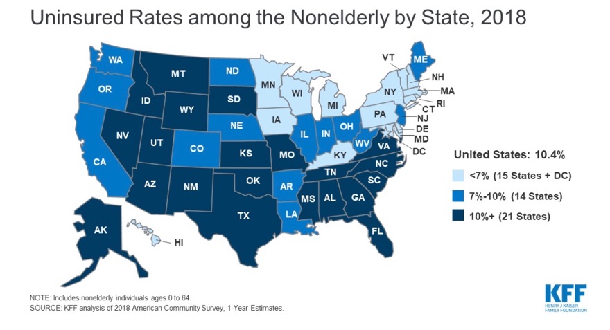 Uninsured rates among the non-elderly in the US (Source: Henry J Kaiser Family Foundation)