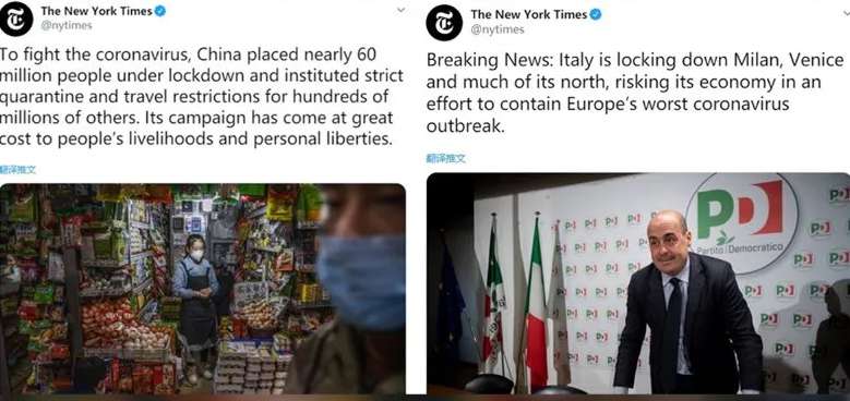 The New York Times has been slammed online for double standards after it recently posted two completely different news tweets about the lockdowns in China and Italy. It called the measure in China a campaign that has “come at great cost to people’s livelihoods and personal liberties”, while saying that Italy is “risking its economy in an effort to contain Europe’s worst coronavirus outbreak”, according to the WeChat accounts of Beijing Daily and China Daily.