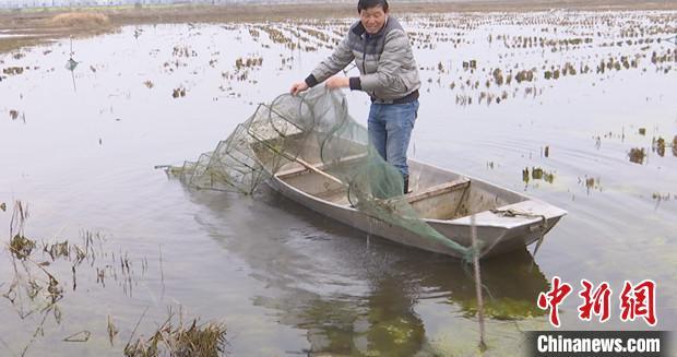 A local farmer in Li county, Changde, central China’s Hunan province, tends Xie Qiangguo’s crayfish pond. (Photo/Chinanews.com)
