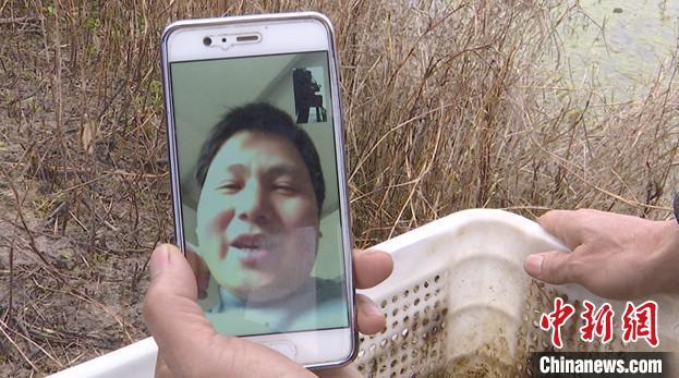 Jiang Zhengdong makes a video call to Xie Guoqiang, showing him his crayfish pond. (Photo/Chinanews.com)