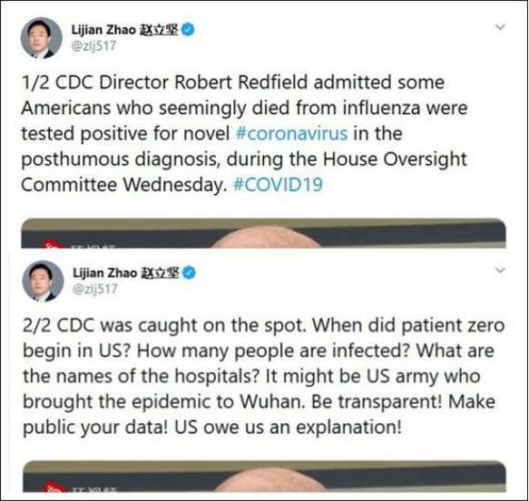 “CDC was caught on the spot. When did patient zero begin in US? How many people are infected? What are the names of the hospitals?” Zhao wrote on Twitter, “It might be US army who brought the epidemic to Wuhan. Be transparent! Make public your data! US owe us an explanation!”