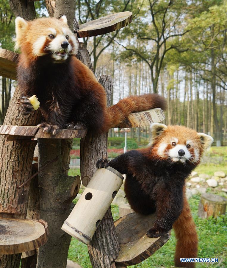 Two red pandas play at Wuhan Zoo in Wuhan, central China's Hubei Province, March 13, 2020. Wuhan Zoo was closed on Jan. 22 after the novel coronavirus outbreak. Dozens of employees in the zoo have been sticking to their posts with feeding and disinfection work for nearly a thousand animals here. (Xinhua/Cai Yang)