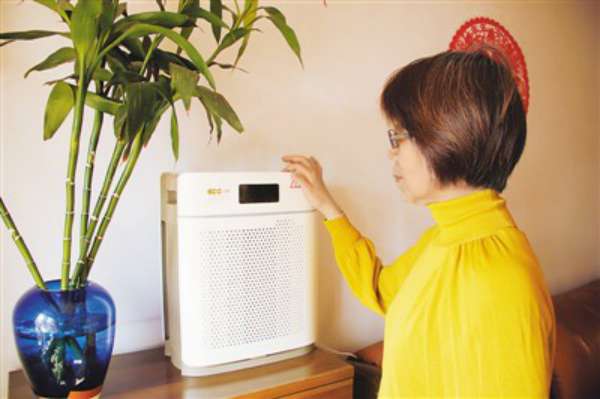 A woman uses air purifier in her home in Beijing. (People's Daily/Xu Peiyu)