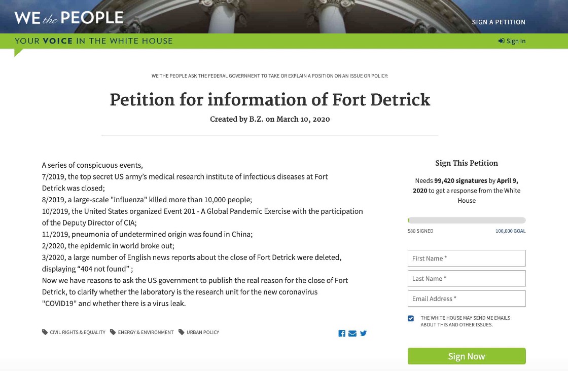 On March 10, a petition was launched on the White House’s website, asking the US government to publish the real reason behind the closure of Fort Detrick. (Screenshot of the White House website)