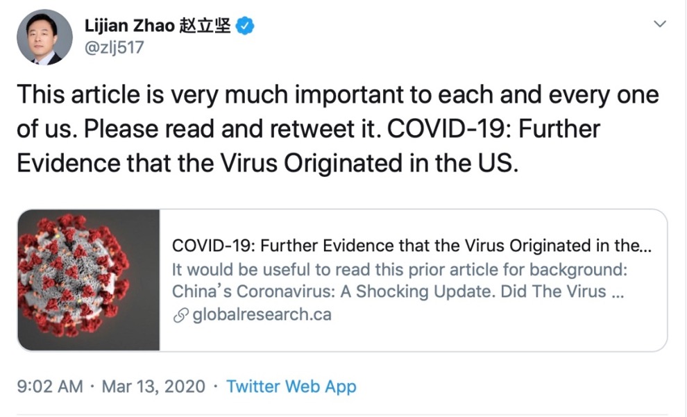 On March 13, Zhao Lijian retweeted a website link that provided further evidence that the virus originated in the US. (Screenshot of Zhao Lijian’s Twitter)