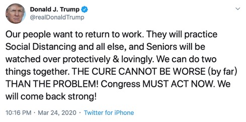 Donald Trump tweets on Tuesday morning that the Coronavirus cure “cannot be worse than the problem itself”. (Screenshot from Trump’s Twitter account)