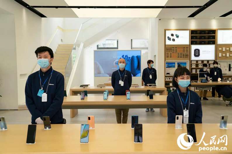 Staff members in a flagship smartphone store prepare to serve customers. (Photo/Chen Liming)