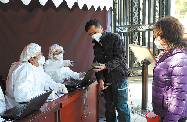 A reservation code is presented and scanned by cemetery workers before people are allowed to enter during the outbreak. [WANG ZHUANGFEI/CHINA DAILY]