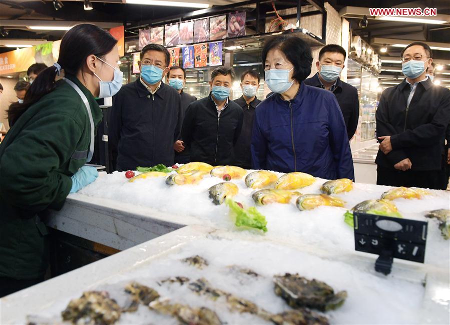 Chinese Vice Premier Sun Chunlan, also a member of the Political Bureau of the Communist Party of China Central Committee, visits a supermarket in Wuhan, central China's Hubei Province, April 7, 2020. Sun, who is leading a central government group to oversee the COVID-19 epidemic control work in Hubei, inspected railway and bus stations, shopping malls, supermarkets and restaurants in the central China city on Tuesday, a day before the lifting of travel restrictions imposed on Jan. 23 to stem the outbreak. (Xinhua/Li He)