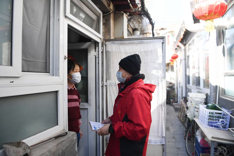 Community worker Mu Tianxiang (R) visits a resident at Xiaojingchang Hutong in Dongcheng District of Beijing, March 10, 2020. (Xinhua/Ju Huanzong)