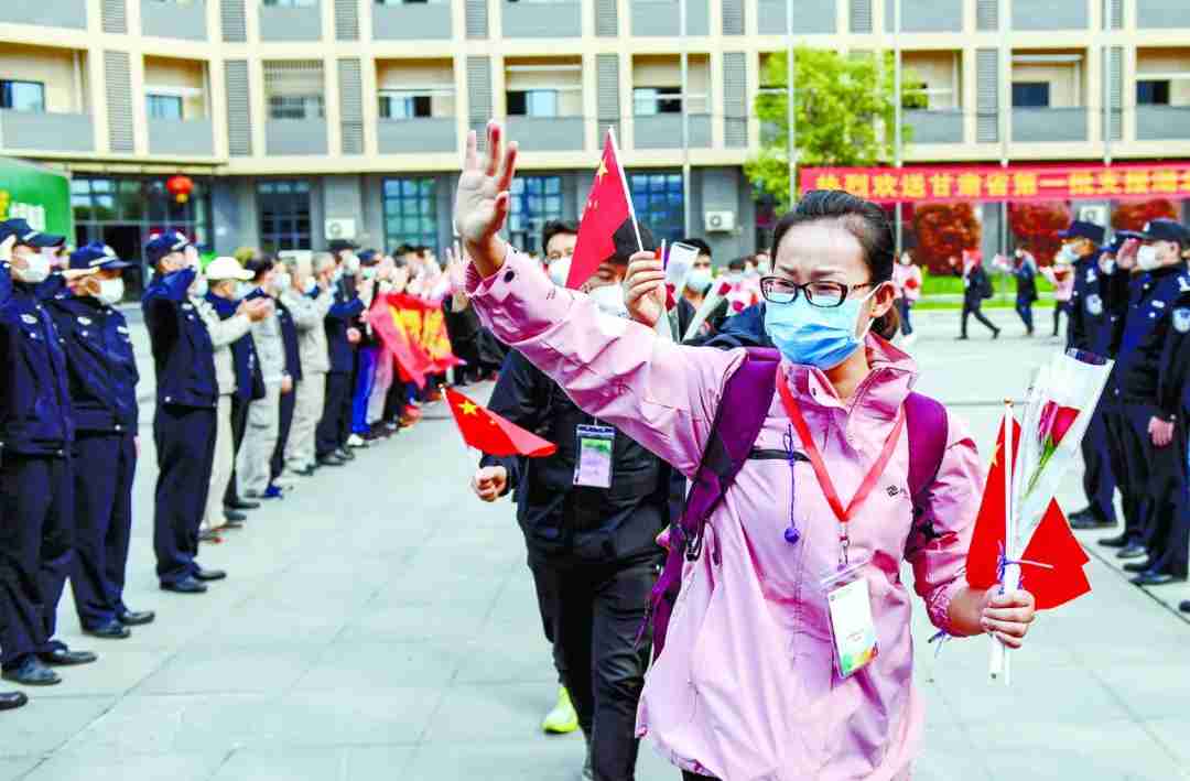 On March 21, medical assistance team members from Gansu province said their farewells to local people who had lined up to salute them in Wuhan. From March 17, medical assistance teams supporting Hubei from across the country started leaving the province as the outbreak had been subdued.