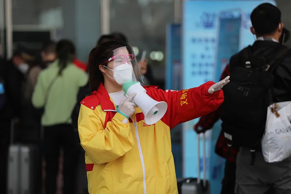A volunteer helps guide travelers at the Wuhan Railway Station on April 8. (By Li Ge, China Photographers Association)