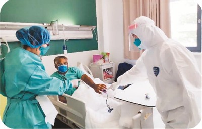 Photo taken on April 11 shows Chinese experts, dispatched to help Laos with its fight against the COVID-19, visiting confirmed COVID-19 patient at Mittaphab Hospital (150 hospital), a designated hospital for treating COVID-19 patients in Vientiane, capital of Laos. (Photo provided by the Chinese anti-epidemic medical expert team to Laos)
