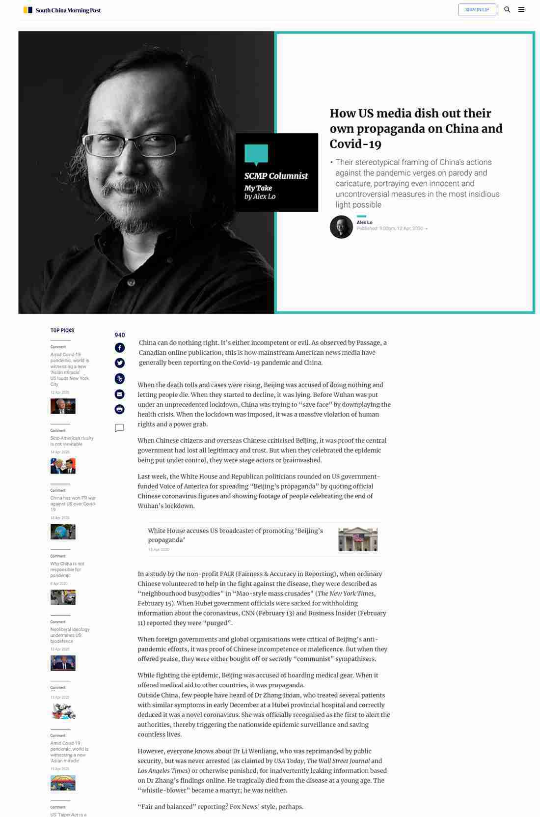 In the wake of the deteriorating COVID-19 pandemic situation outside China, a number of foreign politicians and media outlets have been pointing the finger at China, blaming it for the outbreak, as well as stigmatising its efforts to control and prevent the spread of the lethal virus. In response to such unfair and biased comments, the South China Morning Post columnist Alex Lo published an article on April 12 titled ‘How US media dish out their own propaganda on China and Covid-19’, unveiling the truth behind the stereotypical framing of China’s actions against the pandemic. The author noted that such accusations are despicable, portraying even innocent and uncontroversial measures in the most insidious light possible. Here is a screenshot of the article: