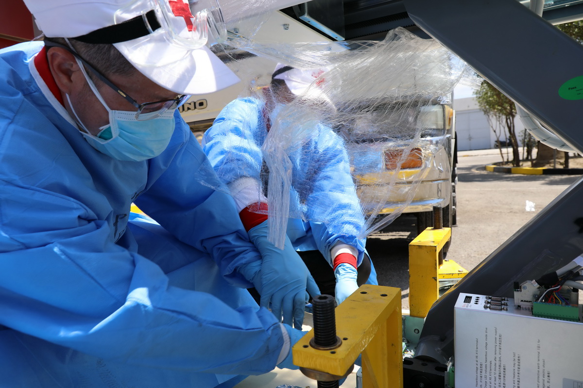 Members of the Chinese team set up CT equipment in Baghdad, Iraq, April 12, 2020. (Xinhua/Zhang Miao)