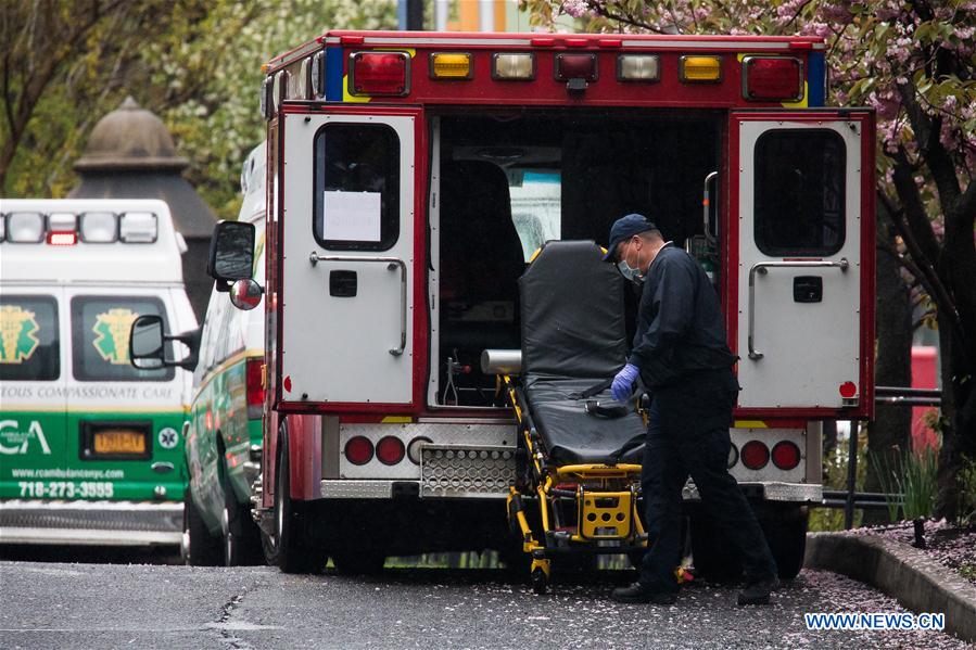 A healthcare worker wheels a stretcher to an ambulance outside Brooklyn Hospital Center in the Brooklyn borough of New York, the United States, on April 24, 2020. More than 50,000 people have died of COVID-19 in the United States while debates are heightening over reopening the country's economy severely battered by the virus. A total of 870,468 cases have been reported in the United States with the death toll reaching 50,031 as of 11 a.m. Friday (1500 GMT), according to the Center for Systems Science and Engineering (CSSE) at Johns Hopkins University. (Photo by Michael Nagle/Xinhua)