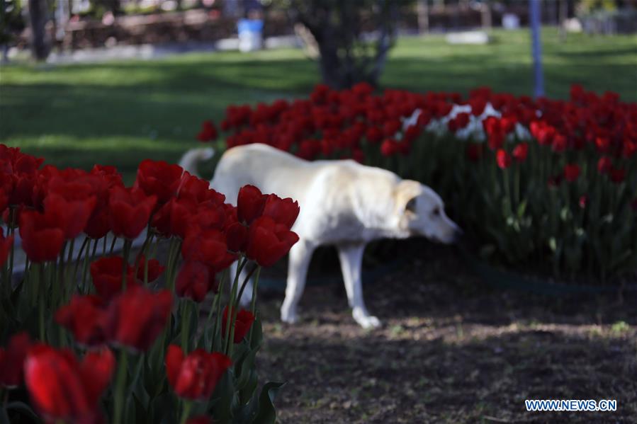 A dog walks among tulips at Altinpark in Ankara, capital of Turkey, on April 25, 2020. (Photo by Mustafa Kaya/Xinhua)