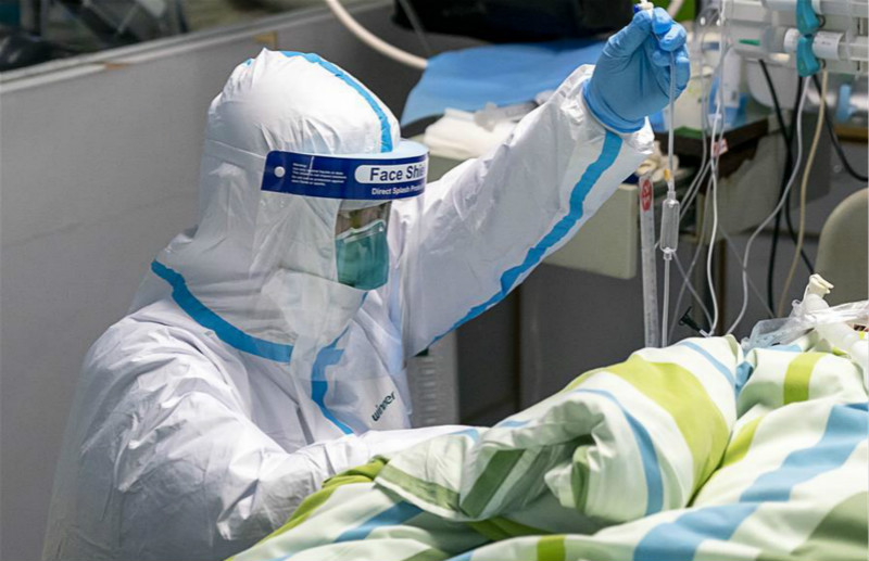 A medical worker gives a patient medical treatment in the ICU (intensive care unit) in Zhongnan Hospital of Wuhan University in Wuhan, central China's Hubei Province, Jan. 24, 2020. (Xinhua/Xiong Qi)