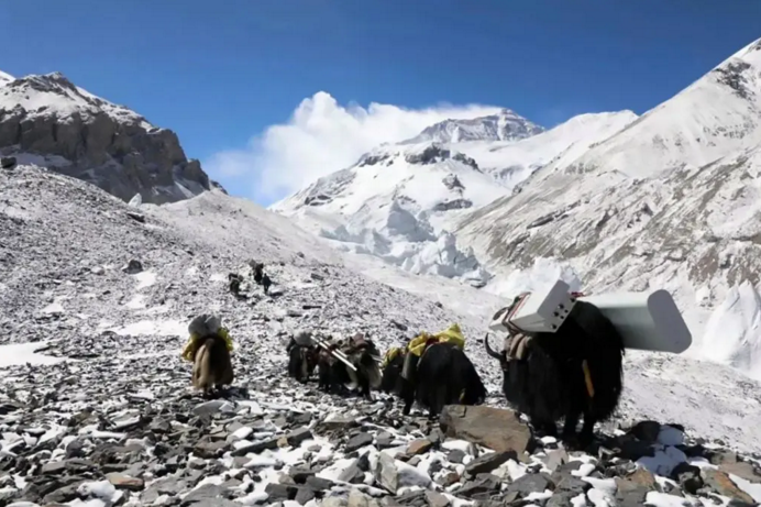 When the roads become impassable to vehicles on Mount Qomolangma at 5,300 meters above sea level, yaks are used to transport 5G base station equipment. In total, 8 tons of network construction equipment and life support materials have been transported to the base station using this system.