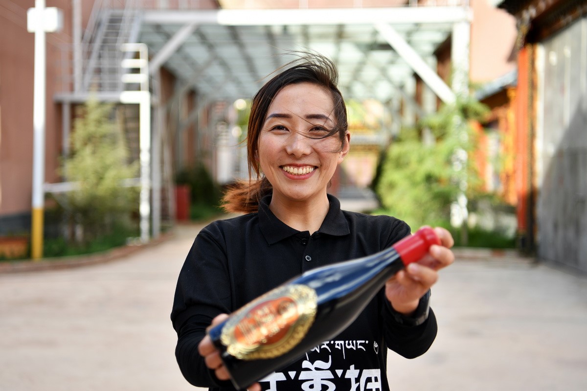Qogco, deputy general manager of a wine company in Mangkam county, shows wine produced by her company, May 4. (Photo by Zhan Yan/Xinhua)