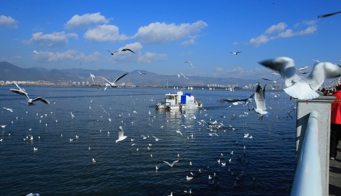 Red-billed gulls from Siberia come to Dianchi Lake, Kunming, southwest China's Yunnan province to winter, attracting a large number of visitors, Jan. 19, 2019. Photo by Zhu Wenbiao/People's Daily Online