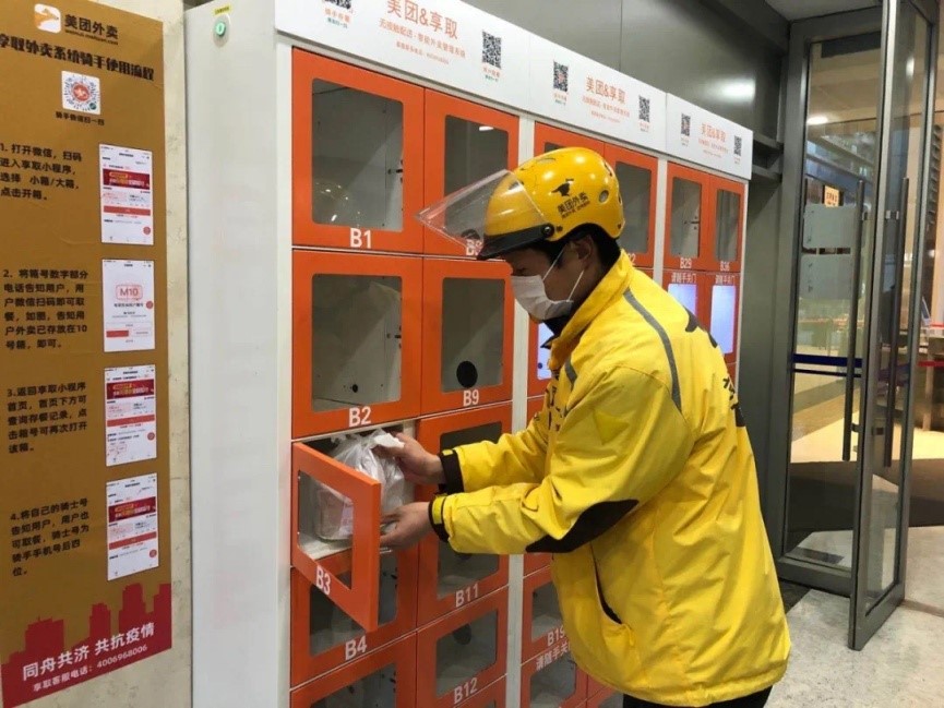 Meituan first adopted the facilities for contactless delivery in Shanghai on Feb. 21. Equipped with ultraviolet disinfection and heat preservation functions, the food cabinets can ensure proper hygiene standards while reducing the risk of cross-infection.