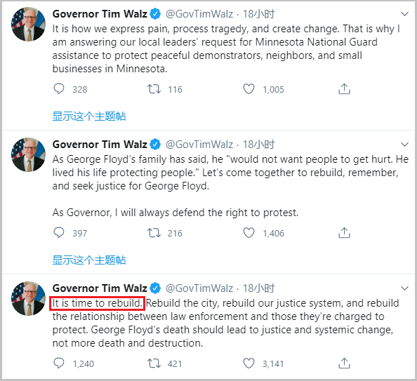 A screengrab from Minnesota Governor Tim Walz's Twitter account on May 29, 2020, shows that he tweeted consecutively about the Minneapolis tragedy, saying "It is time to rebuild." (Xinhua)